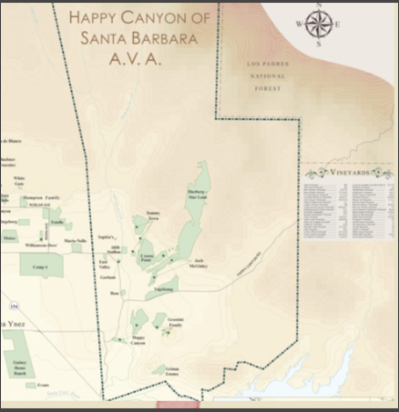 Located in the easternmost end of the Santa Ynez Valley AVA, north and west of Lake Cachuma, the Happy Canyon sub-AVA is the warmest micro-climate in this region and thus able to branch out from the usual Pinot Noir and Chardonnay, which dominate the Santa Barbara wine scene.